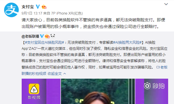 对此,9月1日,支付宝方面回应称:目前各类换脸软件不管换的有多逼真,都无法突破刷脸支付。即便出现账户被冒用的极小概率事件,支付宝也会通过保险公司进行全额赔付。